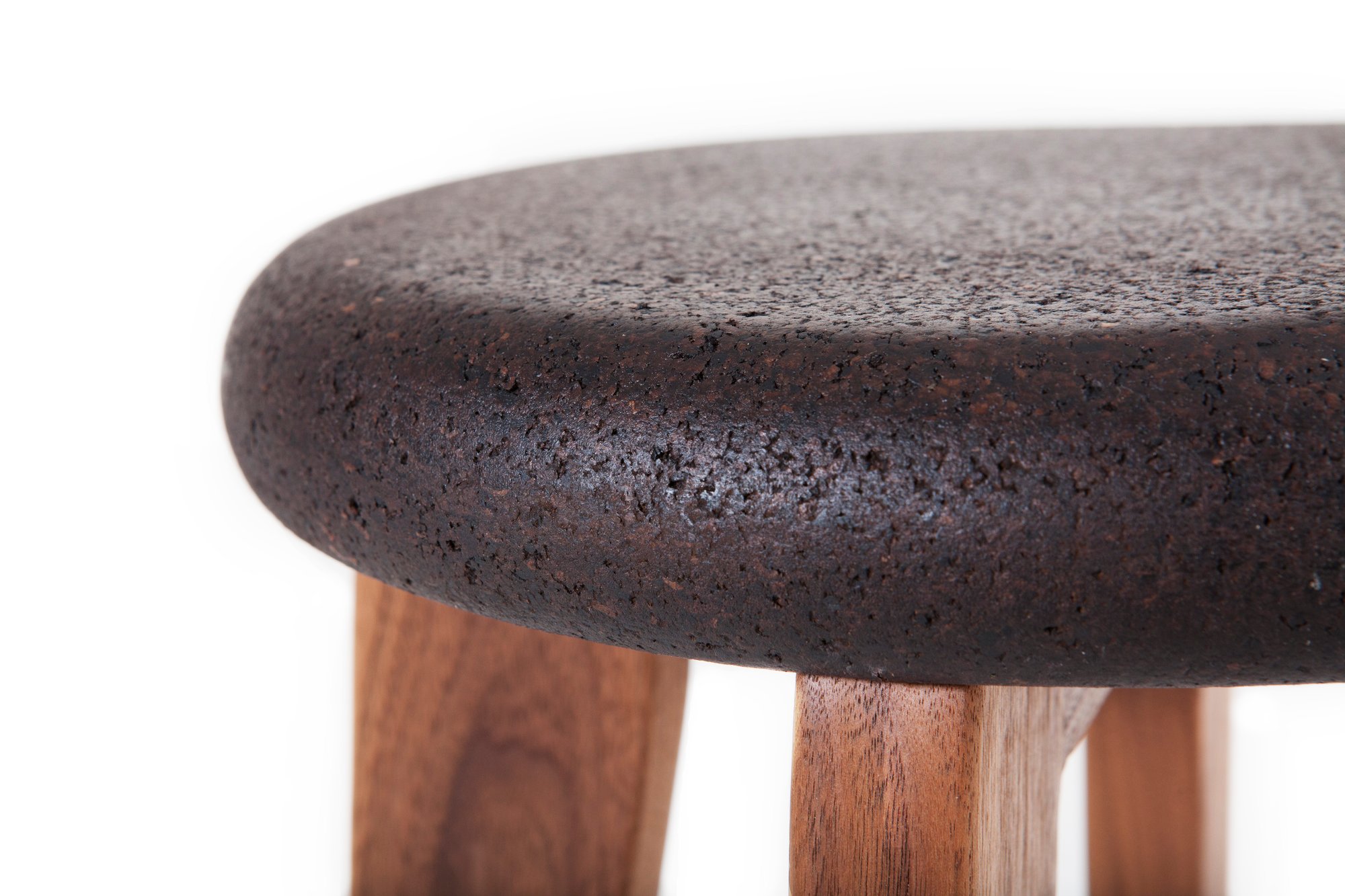 KORK Hocker m ist von den organischen Formen der Kieselsteine und Möbeln der klassischen Moderne inspiriert. Der Hocker ist aus massivem Nussbaum und gedämpften Kork gefertigt. Die Sitzhöhe beträgt 450 mm. Er eignet sich ebenso als Beistelltisch. Optional kann er aus massiver Esche und naturfarbenem Kork gefertigt werden.